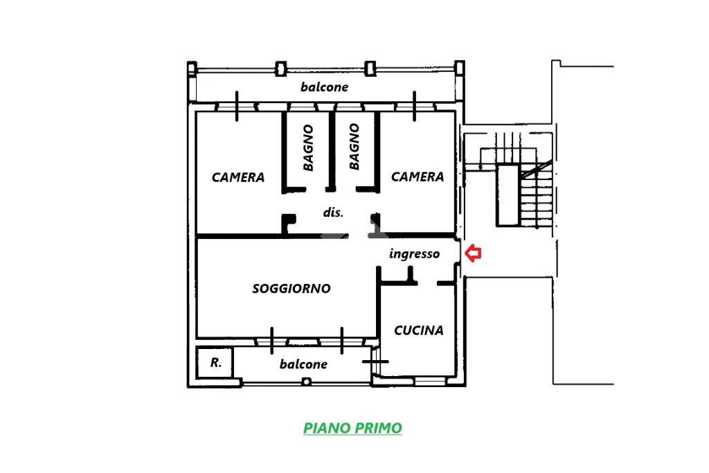 L'abitazione, di 102 mq, si trova al primo piano della palazzina, edificata nel 1993. L'ingresso si apre sulla zona giorno, composta da un ampio soggiorno e la cucina abitabile. Il disimpegno serve la zona notte, composta da due camere da letto e due bagni.
