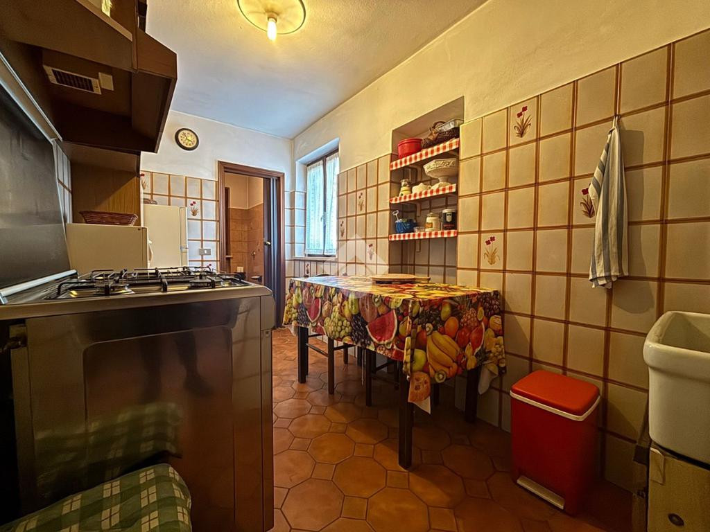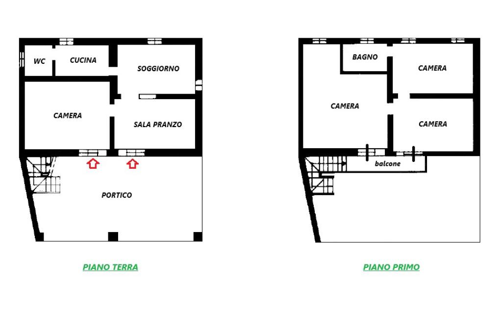 L'abitazione, di 185 mq, si sviluppa su due livelli. Il piano terra si compone di sala da pranzo, soggiorno, cucina, bagno con doccia e una camera da letto. Tramite la scala a chiocciola posta nel soggiorno si accede al piano primo, suddiviso in tre camere da letto e bagno con vasca. Il piano primo è raggiungibile anche attraverso la scala esterna che si collega con il balcone di circa 5 mq, accessibile inoltre da due delle camere da letto.