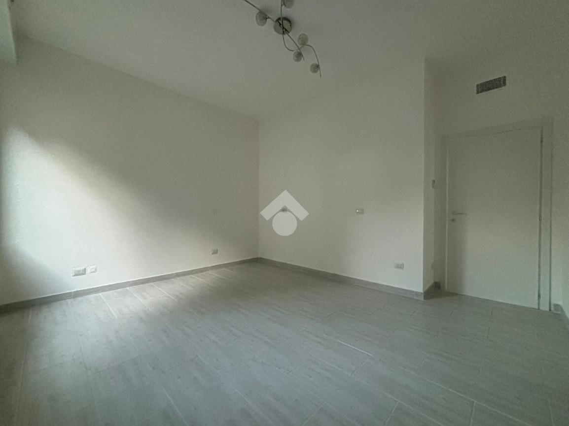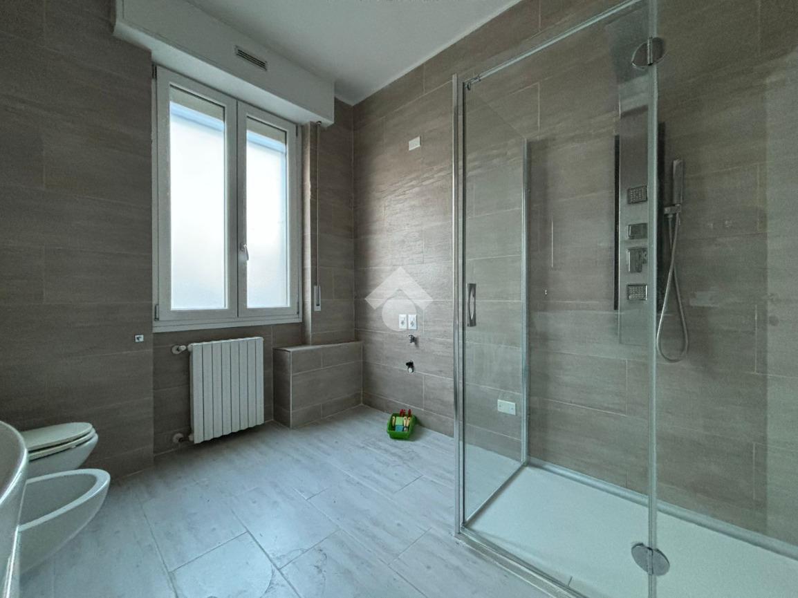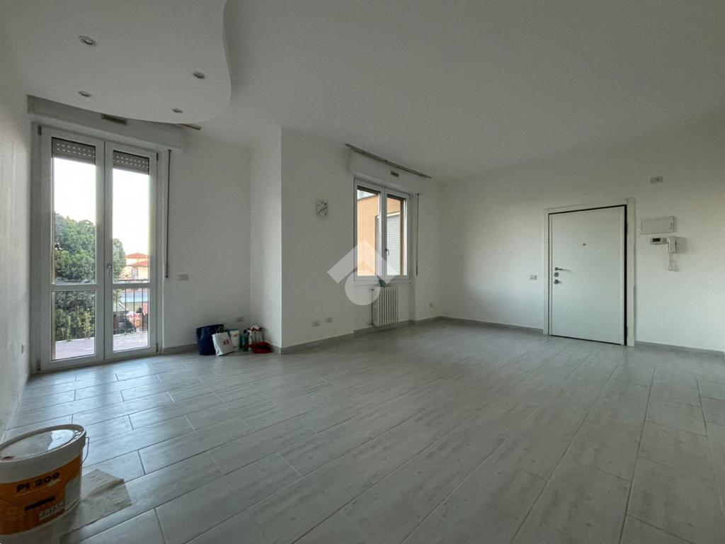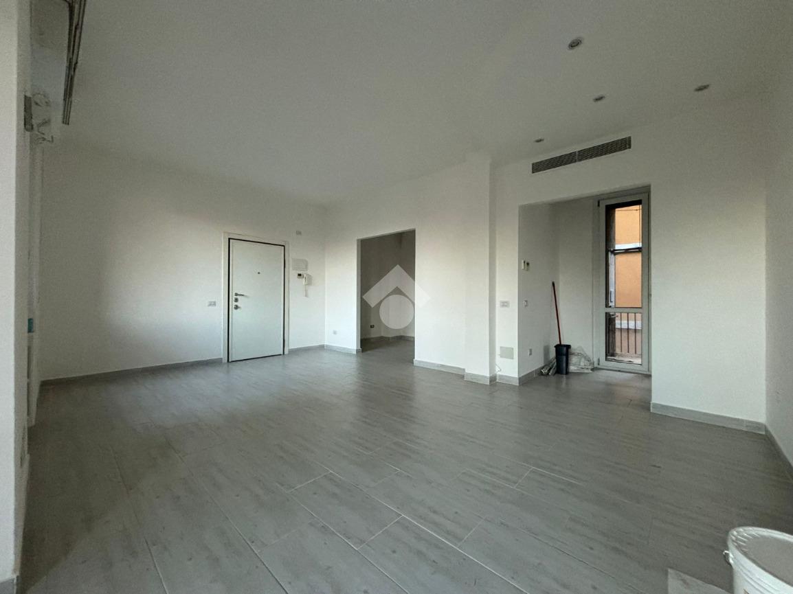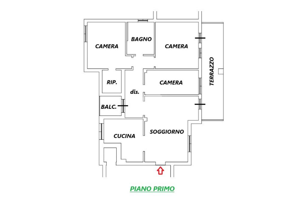 L'appartamento, di 123 mq, si trova al primo piano della palazzina ed è stato recentemente completamente ristrutturato. L'ingresso si apre sulla zona giorno, composta sa un ampio soggiorno e la cucina abitabile. Il disimpegno serve la zona notte, composta da tre camere da letto, di cui una con ripostiglio ad uso cabina armadio, e bagno con doccia. Dal soggiorno e da una delle tre camere da letto si ha accesso al terrazzo di 18 mq, con esposizione a est. Il disimpegno dispone di un secondo balcone di quasi 4 mq.