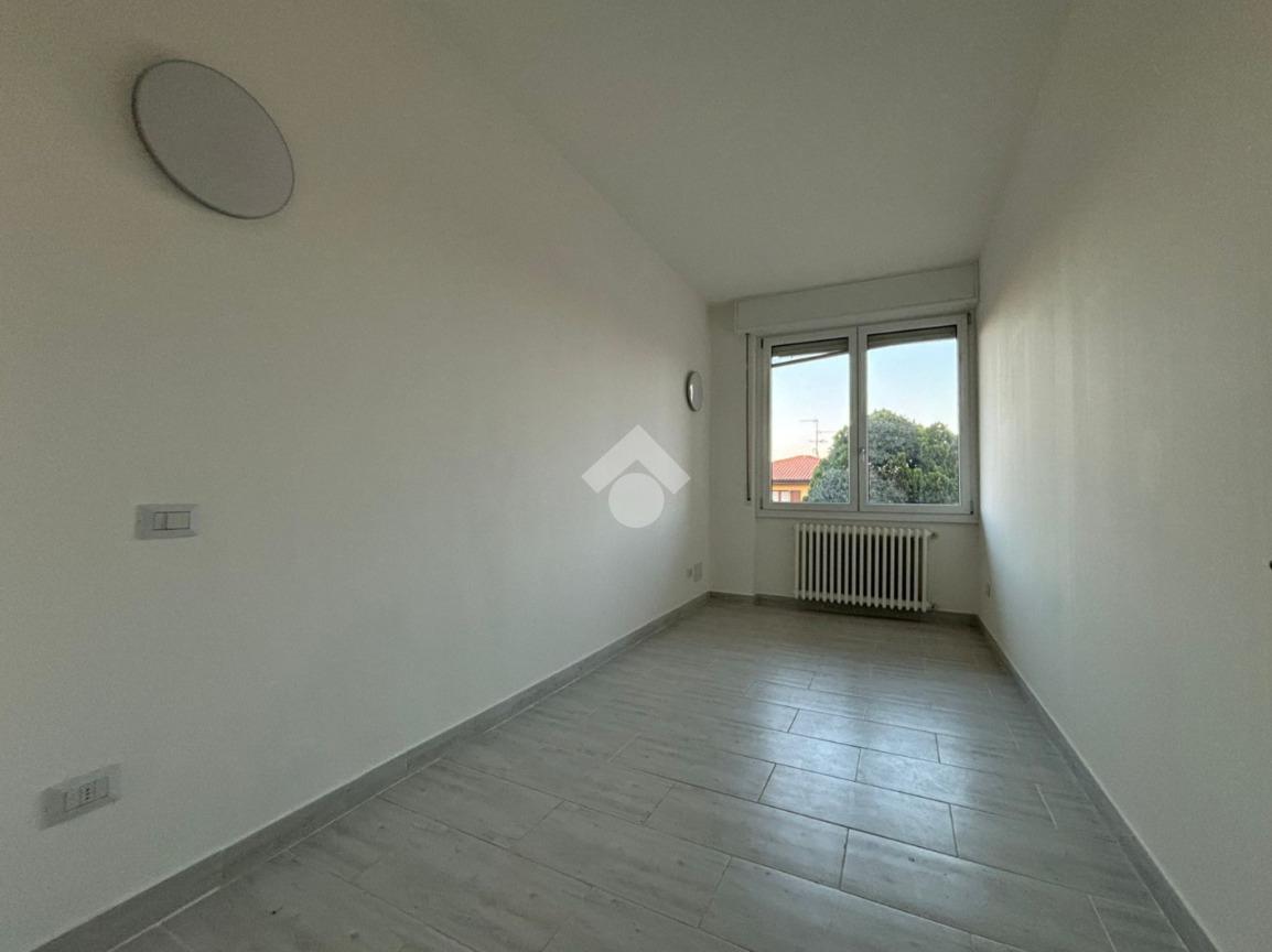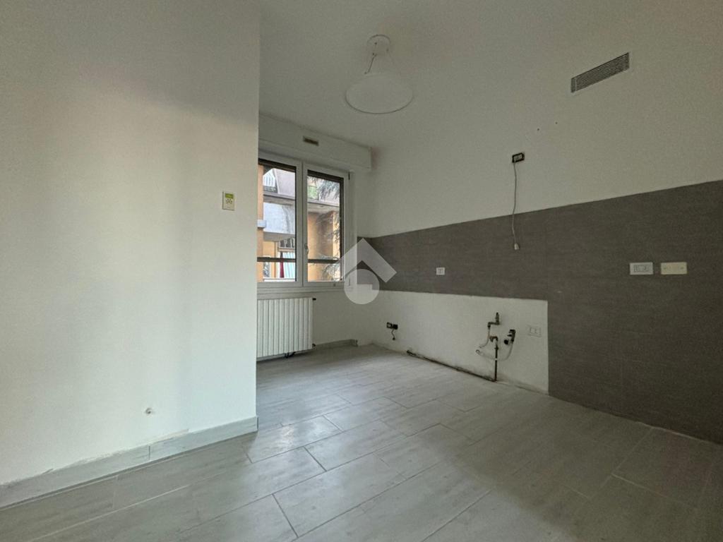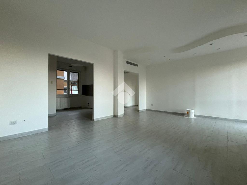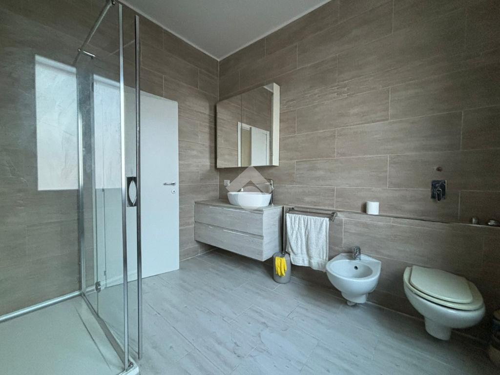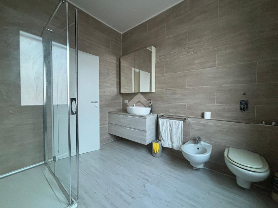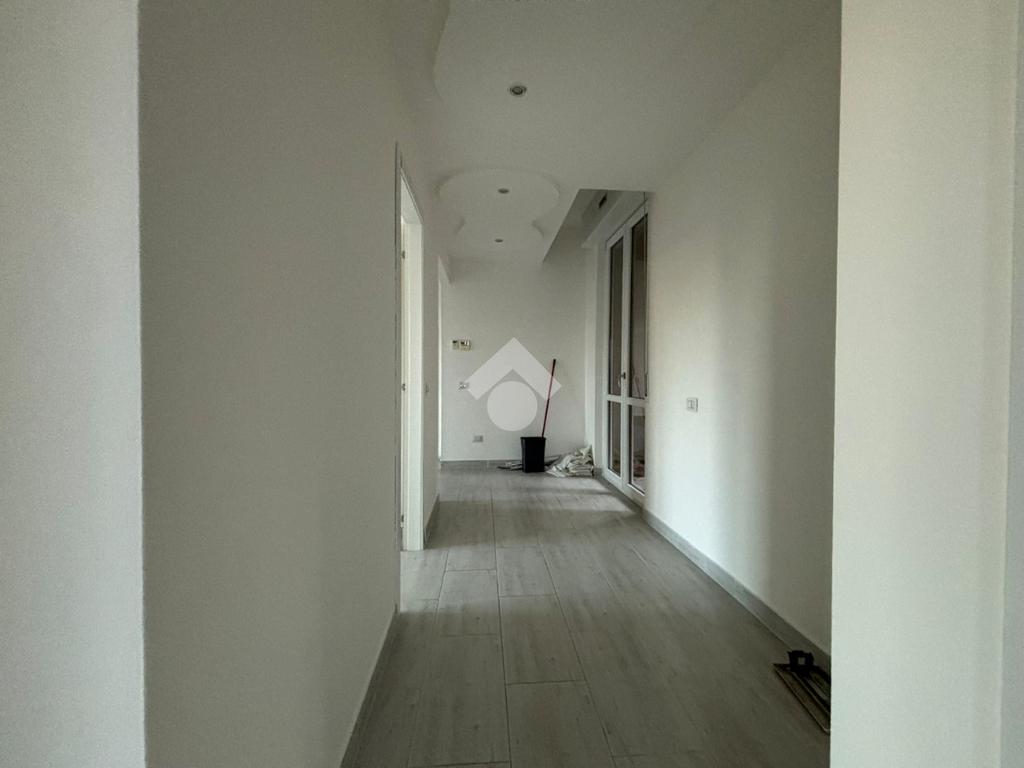 L'appartamento, di 123 mq, si trova al primo piano della palazzina ed è stato recentemente completamente ristrutturato. L'ingresso si apre sulla zona giorno, composta sa un ampio soggiorno e la cucina abitabile. Il disimpegno serve la zona notte, composta da tre camere da letto, di cui una con ripostiglio ad uso cabina armadio, e bagno con doccia. Dal soggiorno e da una delle tre camere da letto si ha accesso al terrazzo di 18 mq, con esposizione a est. Il disimpegno dispone di un secondo balcone di quasi 4 mq.