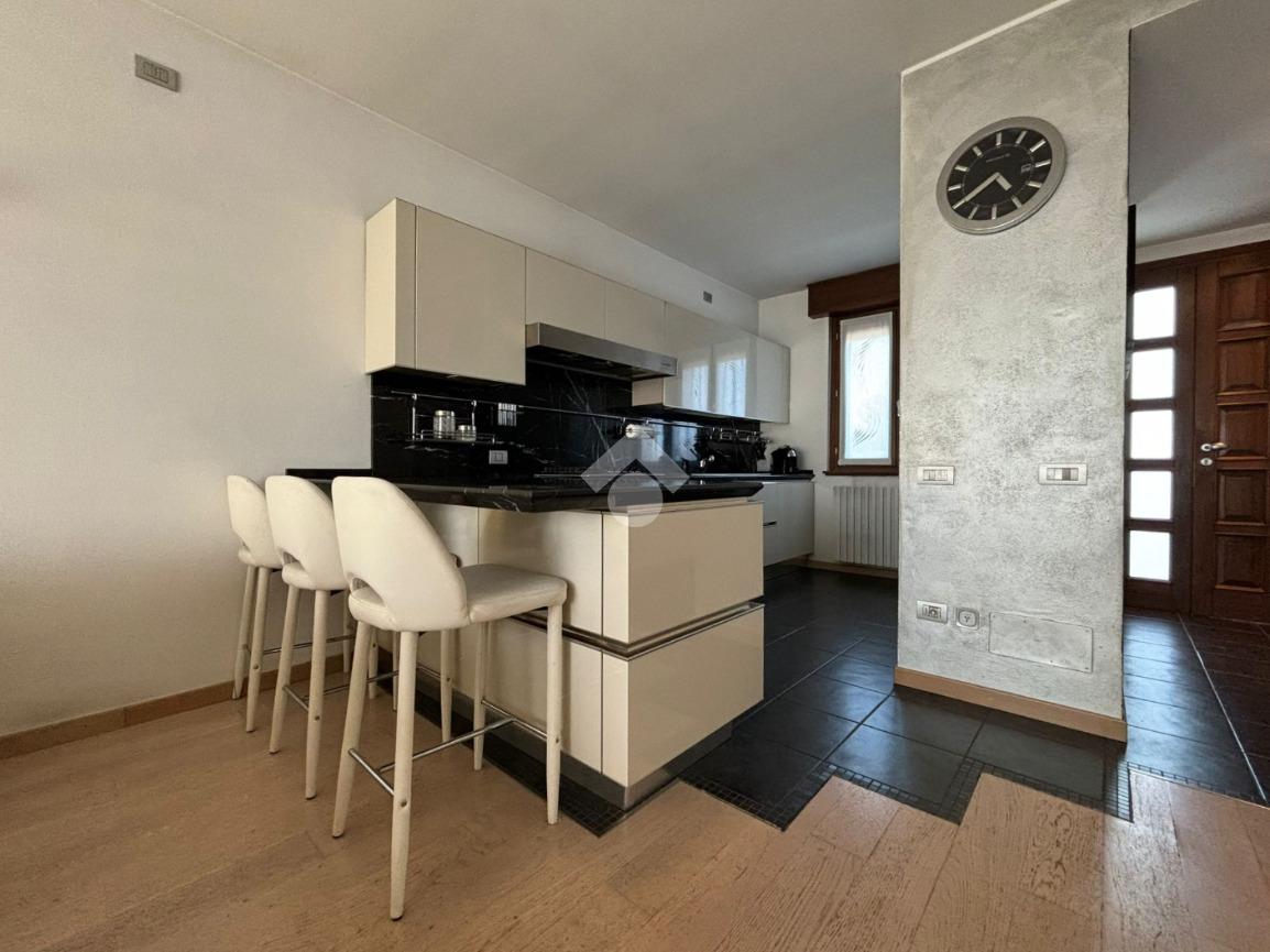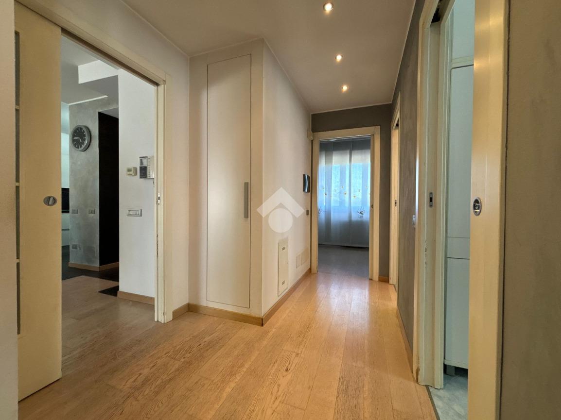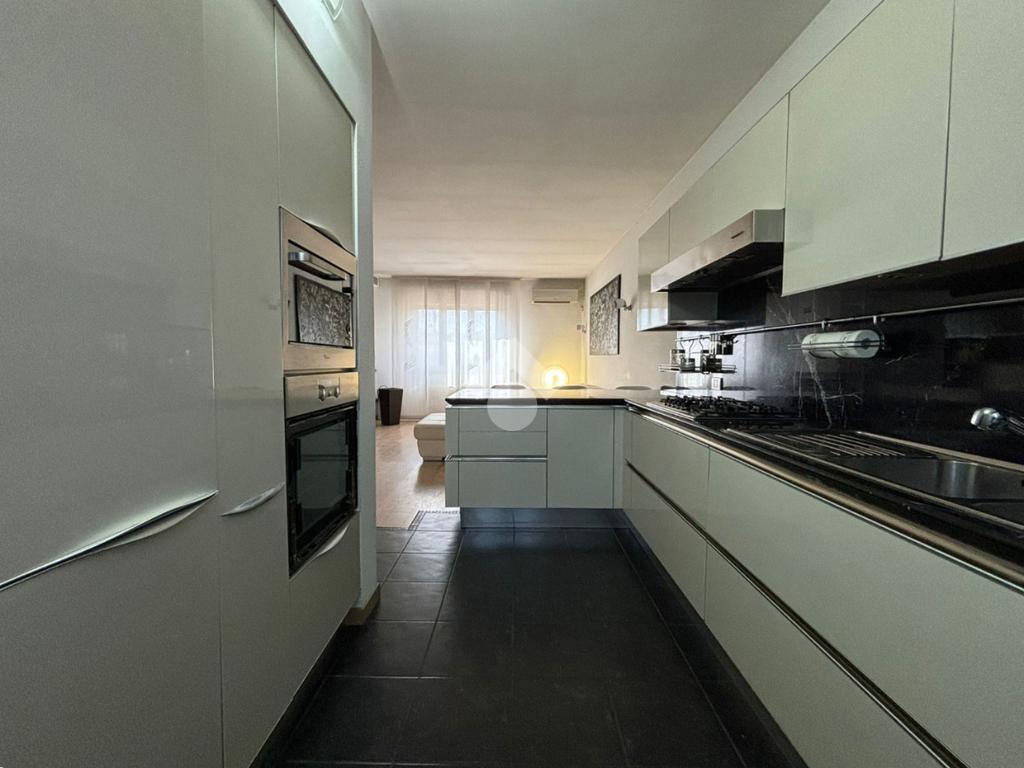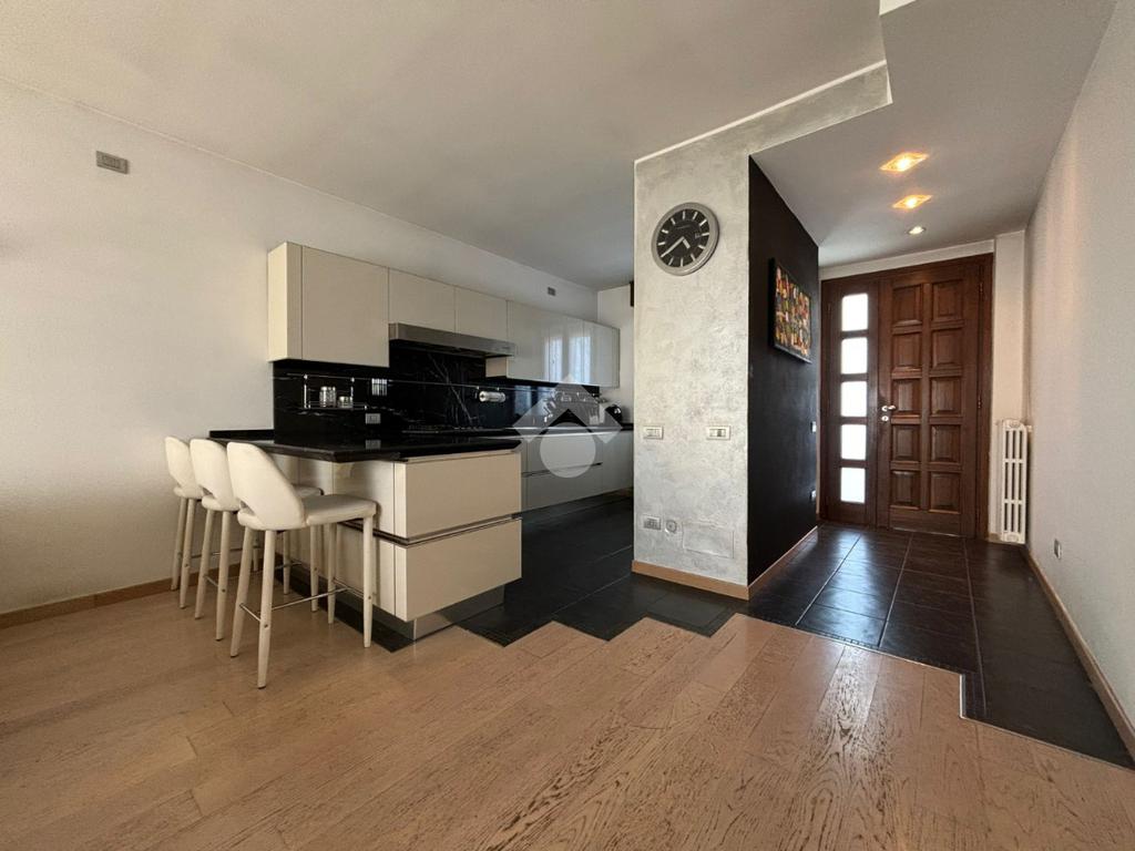Al piano primo troviamo il primo appartamento di 3 locali e doppi servizi ed è raggiungibile attraverso una scala interna. L'abitazione, di 103 mq, si compone di ampia zona giorno open space con angolo cottura, disimpegno, due camere da letto e due bagni, il primo con doccia e il secondo con vasca idromassaggio. L'appartamento dispone di balcone d'ingresso.