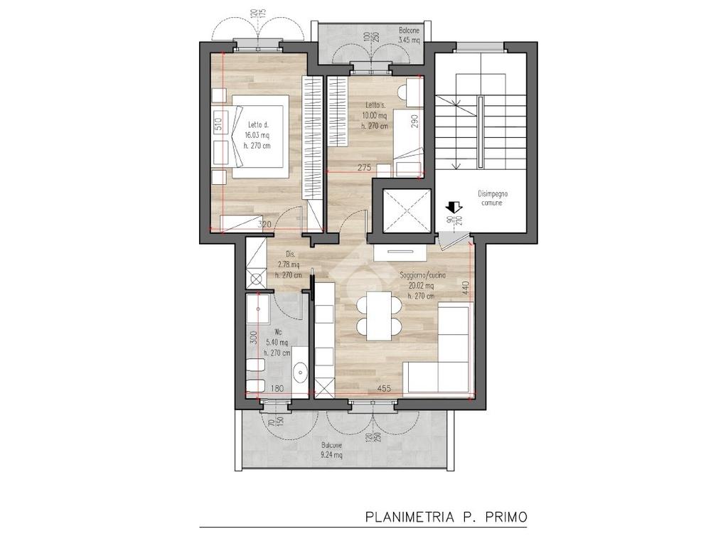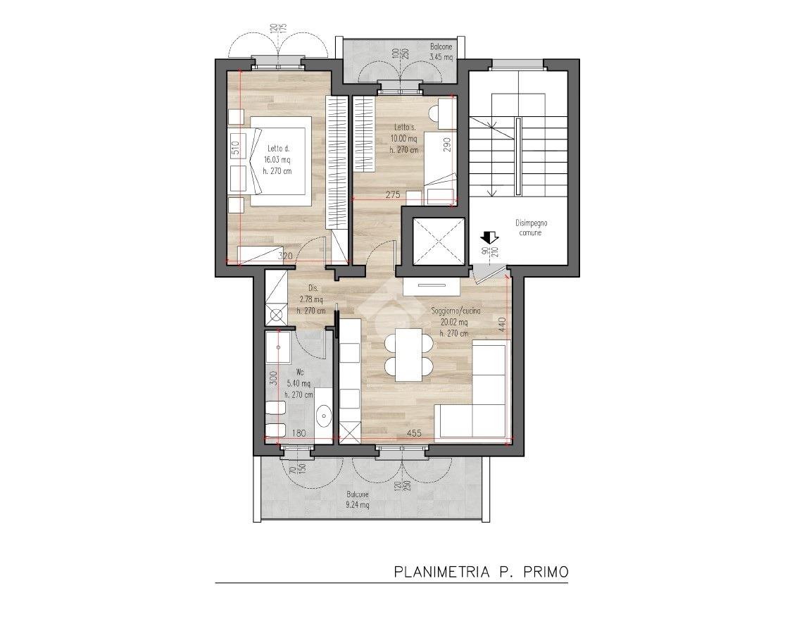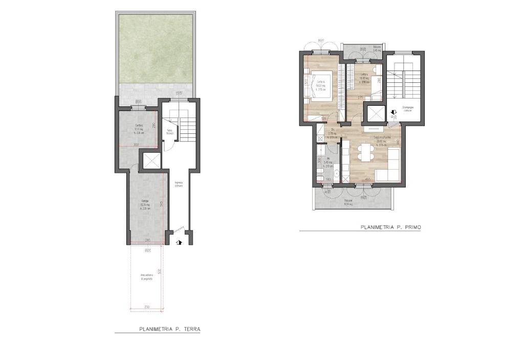 Appartamento di tre locali e servizi con terrazzo e giardino. L'abitazione di trova al primo piano del complesso e si compone di soggiorno con angolo cottura, disimpegno, bagno e due camere da letto. L'appartamento dispone di due balconi, il primo di 9 mq accessibile dal soggiorno con esposizione a sud e il secondo di 3 mq con accesso dalla cameretta ed esposizione a nord.
