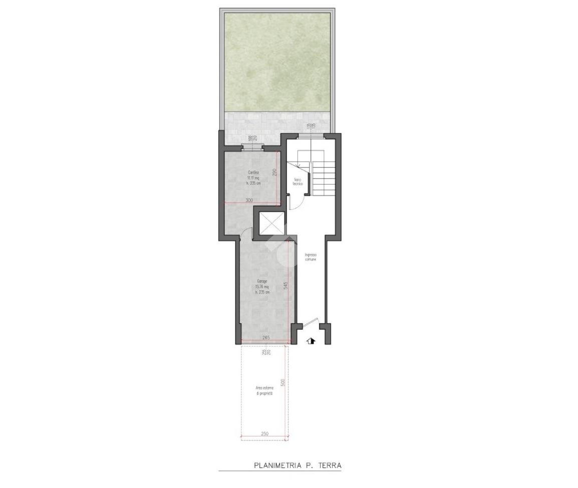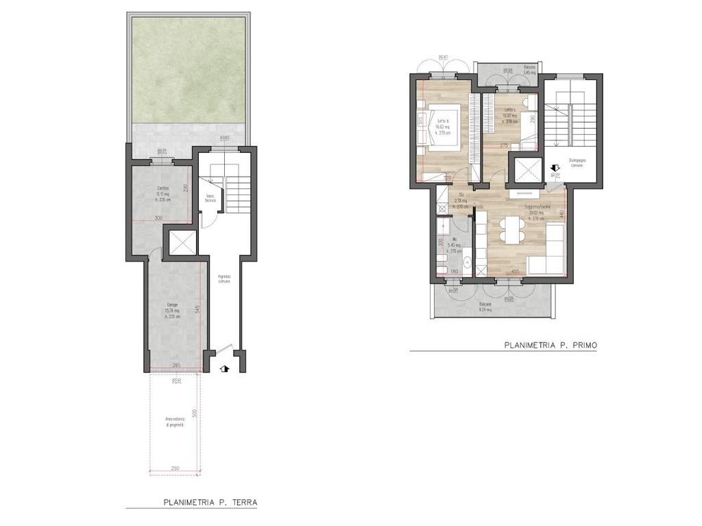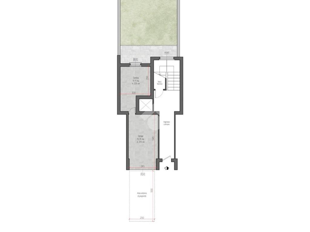 Completano la proprietà la cantina di 11 mq e il box singolo, entrambi al piano terra, con area esterna privata antistante l'ingresso del box. Dalla cantina si accede inoltre al giardino privato di 25 mq