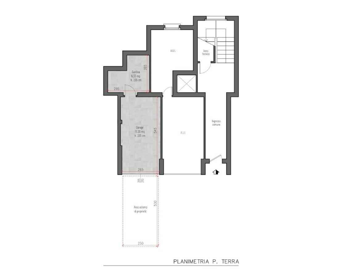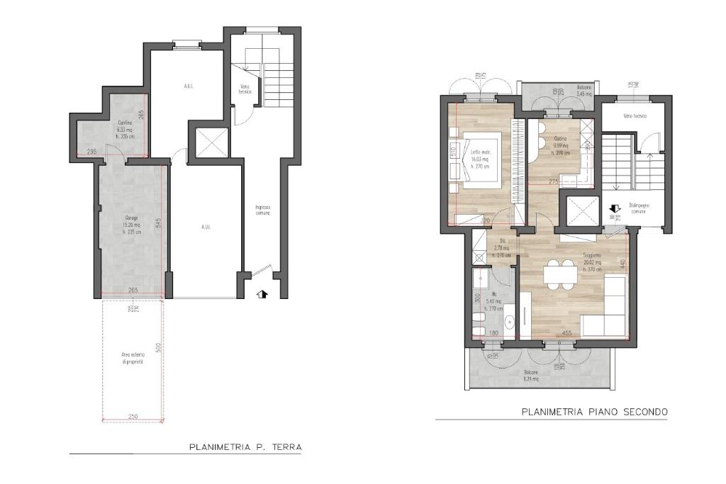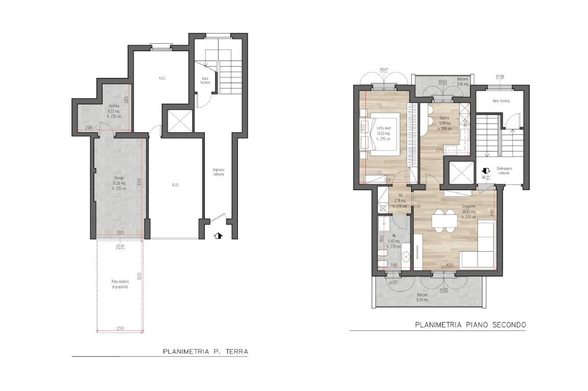 Completano la proprietà la cantina di 6 mq e il box singolo, entrambi al piano terra, con area esterna privata antistante l'ingresso del box.