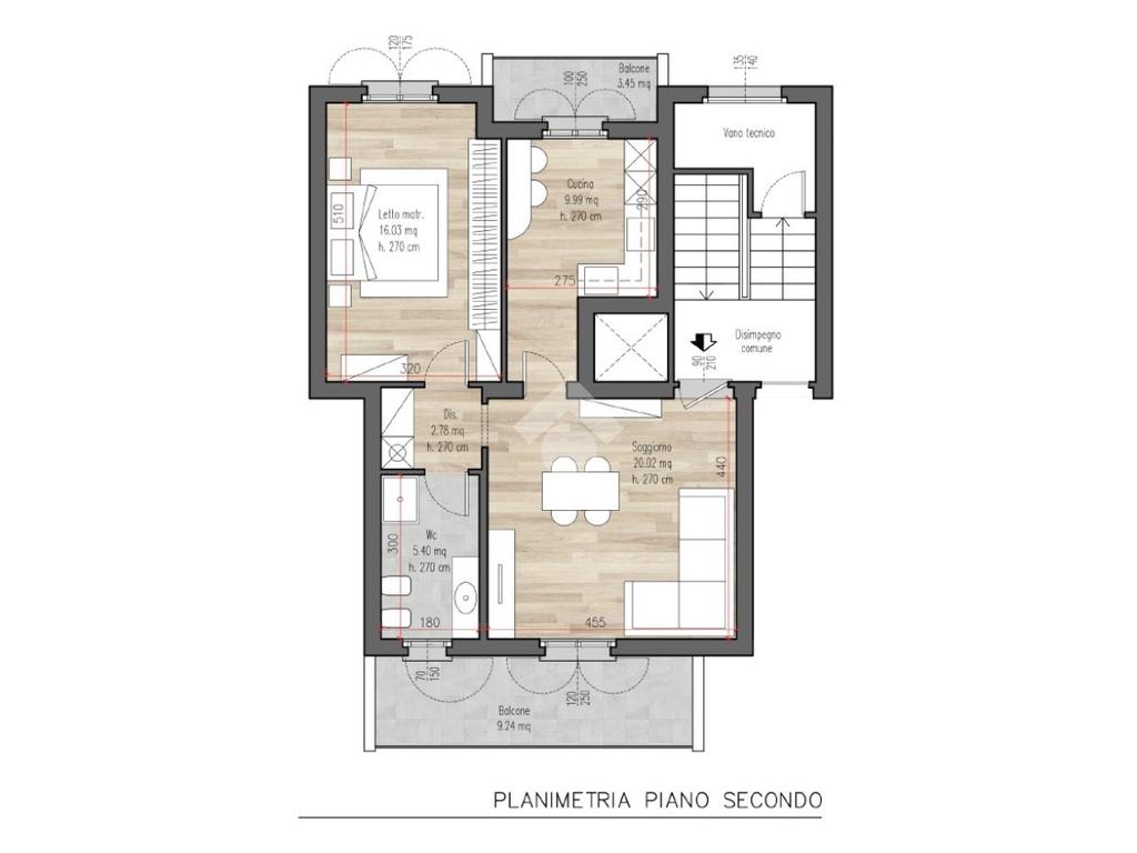 Appartamento di due locali e servizi con box e cantina. L'abitazione di trova al secondo ed ultimo piano del complesso e si compone di soggiorno, cucina abitabile, disimpegno, bagno e camera da letto matrimoniale. L'appartamento dispone di due balconi, il primo di 9 mq accessibile dal soggiorno con esposizione a sud e il secondo di 3 mq con accesso dalla cucina ed esposizione a nord.