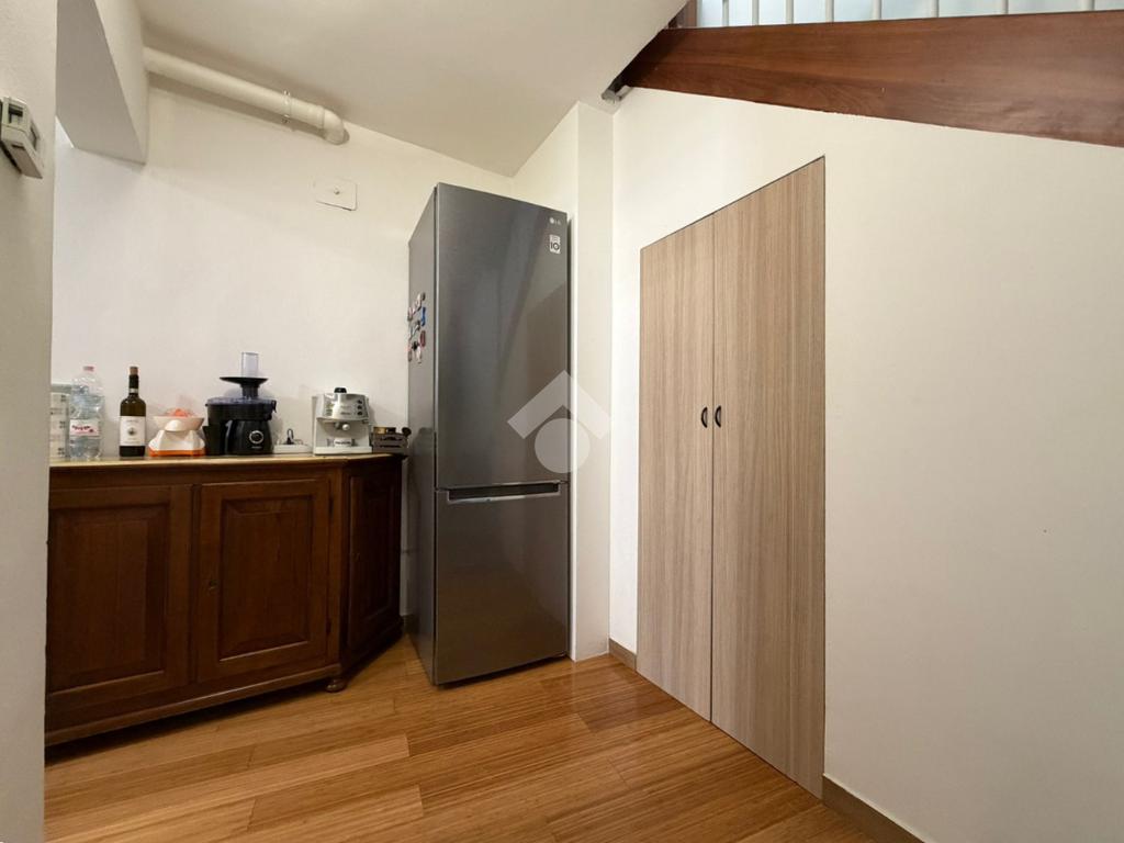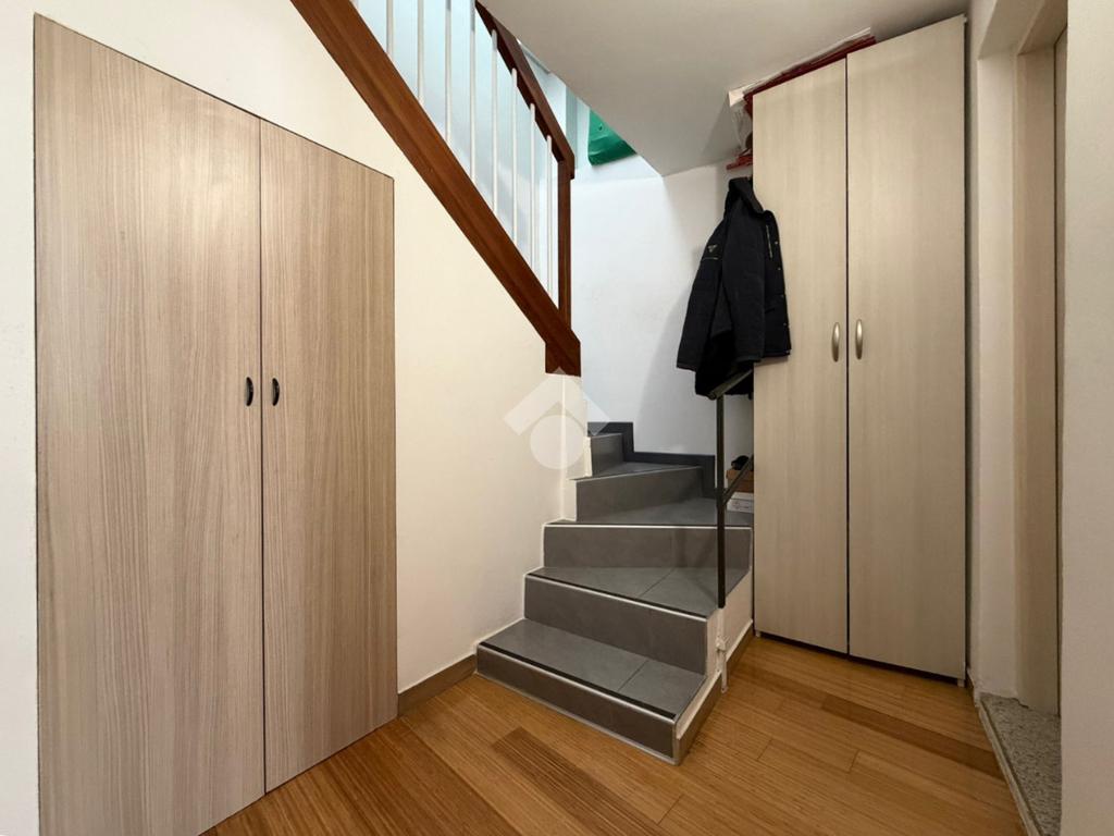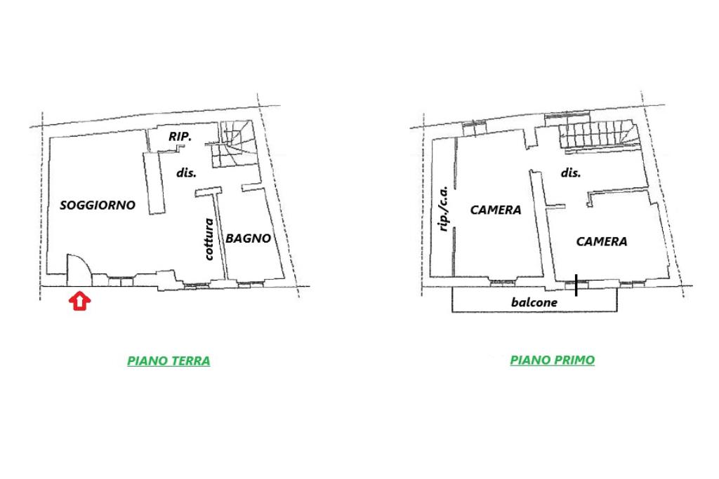 L'abitazione, di 105 mq, si sviluppa su due livelli. L'ingresso si apre sulla zona giorno composta da soggiorno open space con angolo cottura. Al piano terra troviamo inoltre il bagno con doccia, il disimpegno con vano scala e il rispostiglio posto nel sottoscala.
