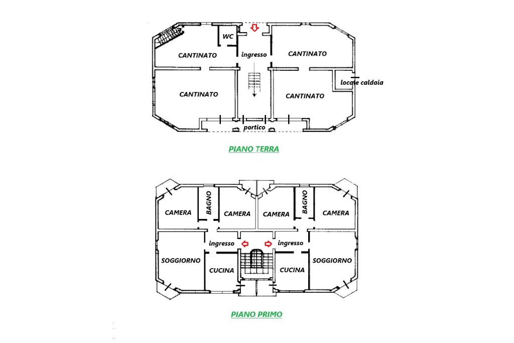 Le parti abitative principali si trovano al piano primo, suddiviso in due appartamenti di 96 mq ciascuna. Entrambi gli appartamenti sono composti da ingresso, ampio soggiorno, cucina abitabile, due camere da letto e bagno. Entrambi gli appartamenti dispongono di 4 balconi ciascuno.