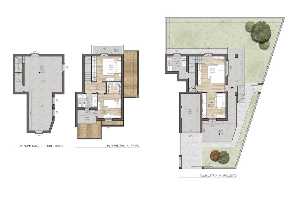 Villa di testa, tre locali e doppi servizi con terrazzo, giardino e cantina rifinita. L''immobile si sviluppa su tre livelli. L'ingresso, al piano rialzato, si apre sulla zona giorno, composta da soggiorno e cucina abitabile. Sullo stesso piano troviamo la lavanderia. La zona notte si trova al piano primo, suddivisa in due comode camere da letto e bagno con vasca. Camera matrimoniale e bagno dispongono entrambi di balcone. Al piano seminterrato si trova la cantina rifinita di 62 mq.